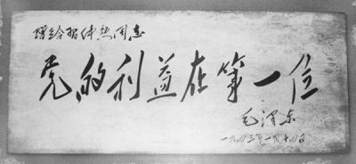 在后来的革命生涯中,习仲勋时常动情地回忆说:“一九四三年一月,毛主席亲笔在一幅约一尺长、五寸宽的漂白布上写了‘党的利益在第一位’八个大字,上款写‘赠给习仲勋同志’,下署‘毛泽东’。这个题词,我长期带在身边,成了鼓励我努力改造世界观的一面镜子。”