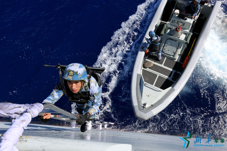 20日,一名特战队员攀爬钢丝梯,登临被“劫持”船只。