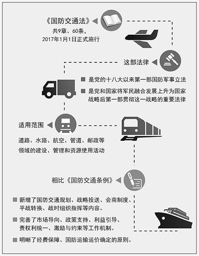 2016年9月,十二届全国人大常委会第二十二次会议表决通过了《中华人民共和国国防交通法》,并于2017年1月1日起施行。该法是党的十八大以来第一部国防军事立法,是深入贯彻军民融合国家战略的第一部重要法律,是我国国防交通建设发展的重要里程碑。