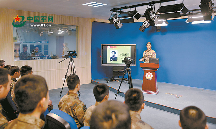 该团一营有线电连指导员刘伟伟在网播中心通过“弹幕直播系统”开展授课,全团官兵通过网络在连队教室、排房甚至训练场上收听收看。雷智勇摄