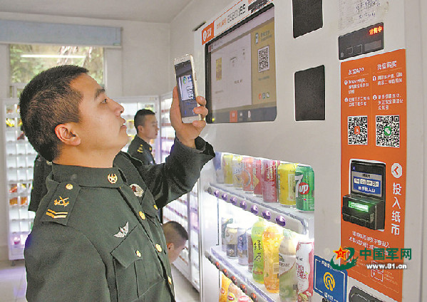 据介绍,五连“网购超市”由多台连接互联网的自动售货机组成,官兵可通过投币、网络支付等多种方式购买商品。同时,自动售货机还具有“远程在线支付”功能,备受官兵欢迎。