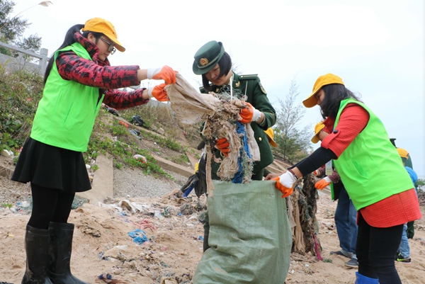 图为边防官兵和志愿者清理海滩垃圾。何秋红摄