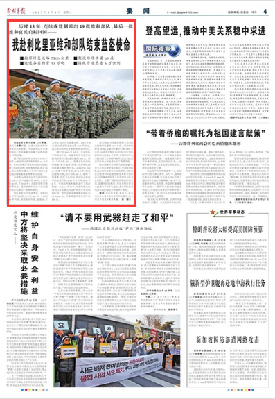 据今天《解放军报》04版要闻报道,历时13年,中国赴利比里亚维和部队已经结束联合国赋予的维和任务,开始回撤。中国第19批赴利比里亚维和部队共124人,于2016年9月部署到利首都蒙罗维亚,是中国军队向这个非洲国家派出的最后一批维和部队。