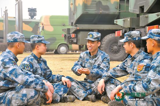 军队人大代表、空军某旅三级军士长杜洪强(中)与战友们进行交流。李卫民摄