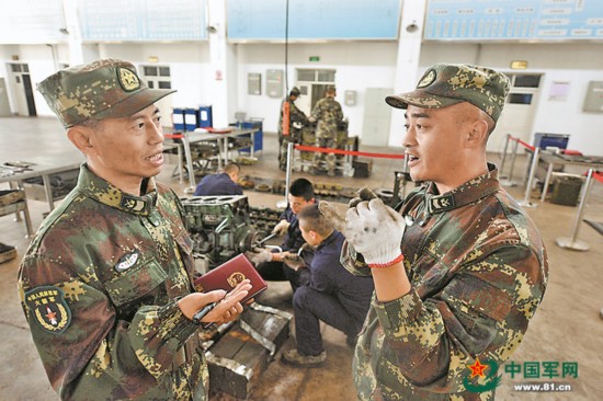 军队人大代表、火箭军某旅一级军士长王忠心(左)深入一线,向官兵征询意见建议。朱珂冉摄