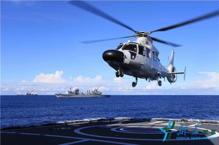 远海训练任务中,海口舰舰载直升机从飞行甲板起飞。严冬 摄