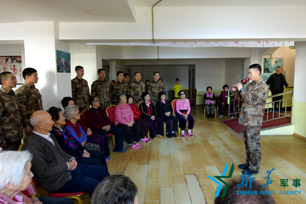 北部战区陆军某边防团通信连战士姜湖为驻地敬老院老人演奏葫芦丝。