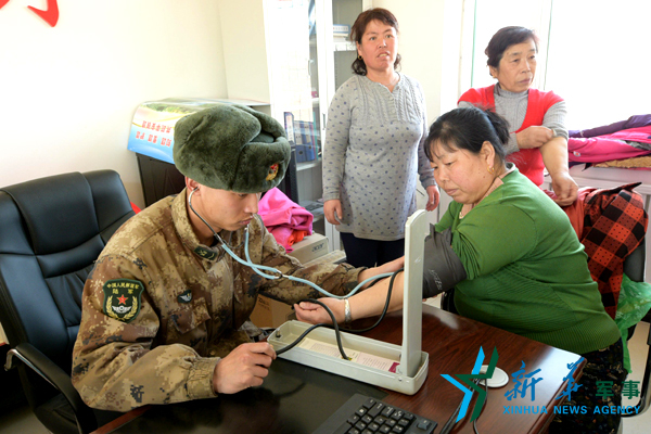 北部战区陆军某边防团医疗小分队卫生员为驻地村民量血压。