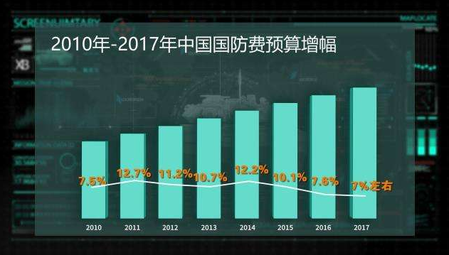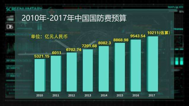 自1999年超过1000亿元人民币,到2017年突破10000亿元人民币,中国的国防实力上了一个新台阶,国防建设与经济建设协调发展进入了一个新阶段。