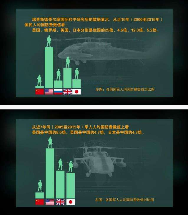 【中国人均国防费为690元人民币,约104美元】相当于美国的1/18、日本的1/4、英国的1/9、法国的1/7、俄罗斯的1/5