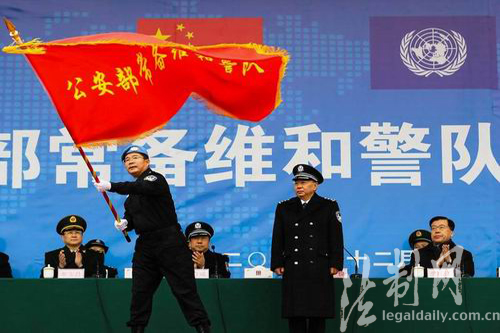 图为公安部部长助理王俭为常备维和挂牌成立授旗