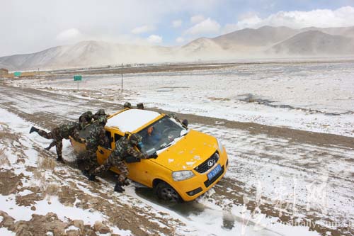 图为西藏边防总队江嘎边防派出所官兵接警后救援被困车辆