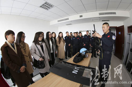 上午9时,一辆挂着“相约蓝盔、爱在警营”红色横幅的大巴车缓缓驶入警队营区。一下车,姑娘们饶有兴致地参观了警队内务设置和装备展示,现场观看了蓝盔方阵扣人心弦的战术表演,队员们气吞万里的练兵激情、敢打必胜的过硬素质,一下子吸引了大家的眼光。在此之前,她们只是在心中默默仰慕那顶“蓝色贝雷帽”,从电视上看到过威武帅气的维和队员。第一次如此近距离接触,让不少姑娘的心中荡起层层涟漪。