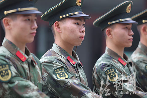 图为正在进行队列训练的官兵,用棍子抵住下巴,来习惯这个动作