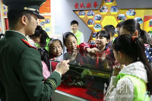 图为同学们好奇地向官兵询问馆内展品的历史