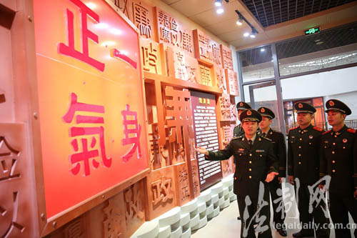 “四知拒贿”、“正气一身”、“以俭养廉”等一幅幅设计新颖、内容丰富、版面鲜活的廉政展板映入官兵们的眼帘……