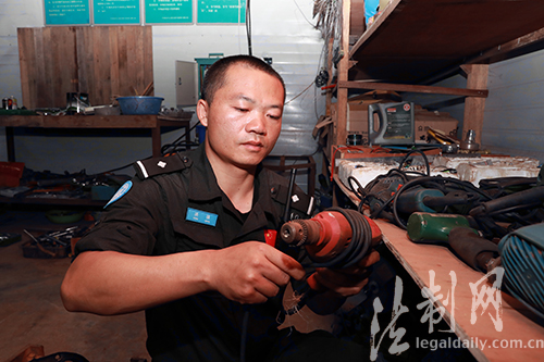 图为队员整理操作间器具,当完成了一天所有的车辆维护工作时,已是凌晨深夜,队员整理“武器装具”入库