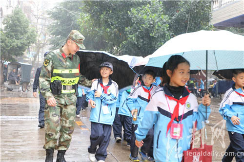 图为在学校放学时,官兵对周边进行安保,并和老师指导学生安全有序的离校