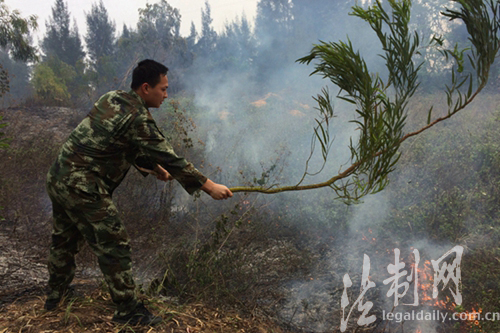 同日下午,这个支队流沙边防派出所官兵在巡逻至当地村委会附近时,发现路边的树林中有强烈的火光,便立即驾驶警车向火光方向赶去。经过观察,官兵发现火势很大,大火燃烧面积超过了3个篮球场大小,火场附近还有几栋民宅。当时林中风力有四到五级,大火随着风势蔓延,将危及群众的生命财产安全。边防官兵决定先集中扑救房子附近火苗,再围堵其他起火点,随即就地取材,折下新鲜的树枝,奋力扑打蹿起的火苗,官兵们走过地上的火星、冒着滚滚浓烟,一步一步向前推进。官兵灭火过程中,闻讯而来的村干部和群众也加入了灭火的队伍,经过警民40分钟左右的奋战,终于将大火扑灭。