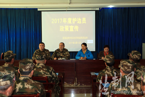 为进一步强化群众护边员队伍建设,为群众护边员提供有力的生活保障,新疆边防总队阿勒泰边防支队富蕴边防大队结合前期政府及新疆边防总队文件通知精神,于4月13日组织派出所驻村干警联系政府“访惠聚”驻村工作组一同组织护边员召开护边优抚宣传会。此次会议旨在进一步将2017年护边员保障的好政策传递到每一名群众护边员当中,并将新制定的边境管控法规对群众护边员进行再宣讲、再教育。加强群众护边员队伍建设,突出人民群众管边护边作用,切实做到在边境一线“人人是哨兵、户户是哨位”的总体目标。(李铭骥)