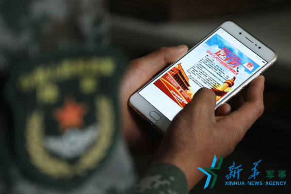 图为警侦连上等兵庄田田为官兵普及国家安全知识。图为官兵通过智能手机浏览学习。何李烊 摄