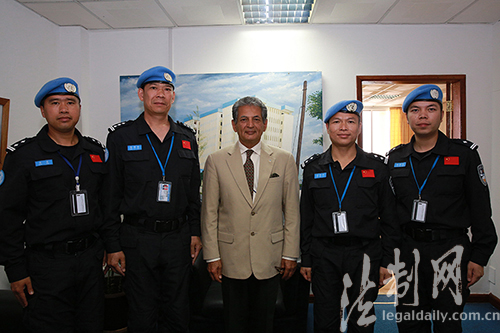 图为联利团秘书长特别代表法里德·扎里夫与中国维和警察防暴队合影