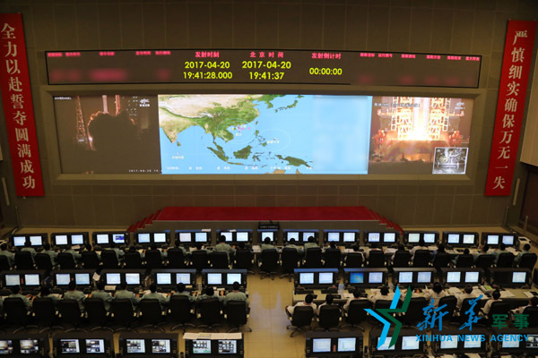 4月20日,北京航天飞行控制中心大厅大屏幕显示,天舟一号货运飞船点火升空。当日19时41分,搭载着天舟一号货运飞船的长征七号遥二运载火箭,在我国文昌航天发射场点火发射,约596秒后,飞船与火箭成功分离,进入预定轨道,发射取得圆满成功。新华社记者 刘芳 摄