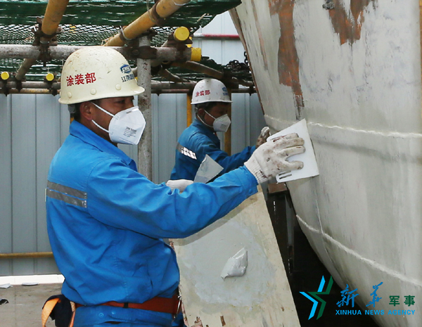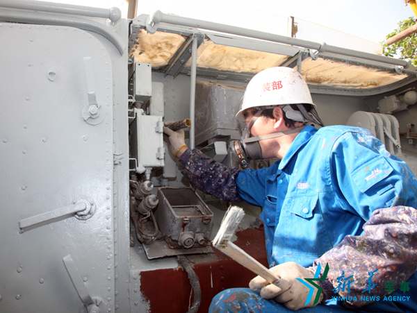 技术人员对舰艇外观进行修复。王钢 摄