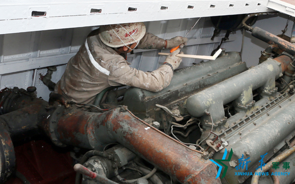 技术人员对舰艇内部设施进行修复。牛进 摄