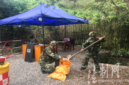 图为执勤官兵利用休息时间清理执勤点环境