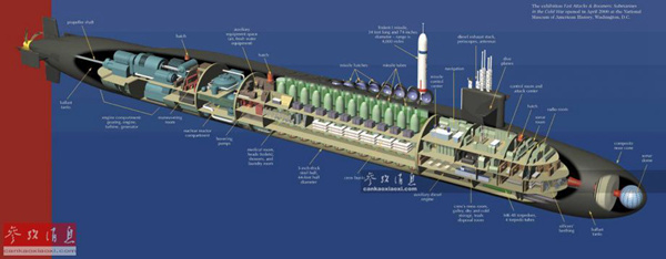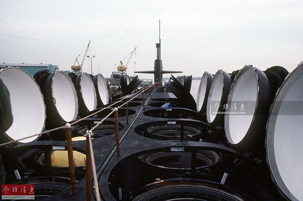 每艘俄亥俄级核潜艇都配备有24个“三叉戟”潜射弹道导弹发射筒,对称于中心线平行布置,共搭载有24枚“三叉戟II”D5潜射核导弹,每枚最多可载12个分导核弹头,条约限制为8个,共计192个分导核弹头。图为俄亥俄级潜艇开启全部发射筒的壮观场面。