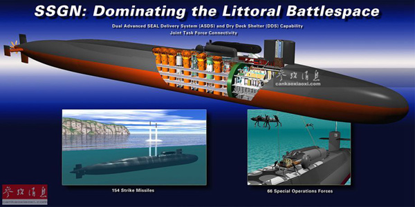 换装了“战斧”巡航导弹后,实际是增强了俄亥俄级的作战灵活度,可不再执行单一的战略核威慑任务,转而投入到常规局部战争中。理论上讲,一艘搭载154枚“战斧”导弹的核潜艇的威慑力,并不亚于战略导弹核潜艇。图为俄亥俄级SSGN搭载的新型七联装VLS,右上图为新VLS与原有的“三叉戟”II导弹发射筒对比。