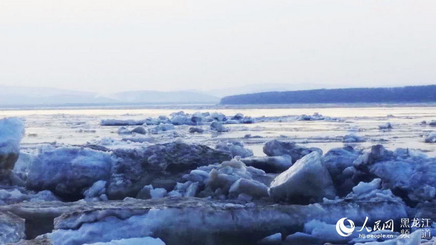 中俄界江黑龙江萝北县名山段开江,大量冰排顺江而下。