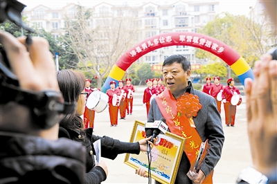 军地领导一起将立功喜报和慰问品送到上海警备区某特警团战士姚志强家中,他的父亲姚念峰手捧奖杯、奖状自豪地接受当地媒体采访。张宁峰摄