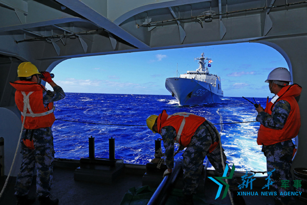 千岛湖舰为昆仑山舰实施航行中的纵向燃油补给