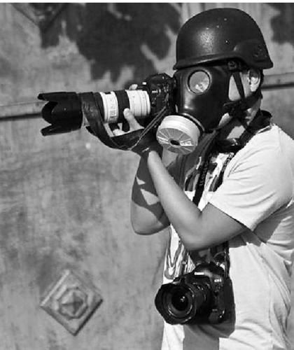 陈序戴着防毒面具进行采访拍摄。(陈序供图)