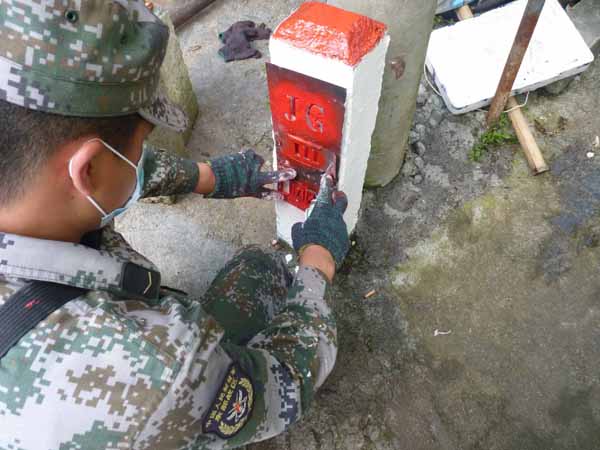 战士正在为线路标石喷漆描字。