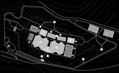 犹他州大数据中心平面示意图。①为访客控制中心,②为技术支持和行政人员的办公空间,③为数据大厅,④-⑦分别为备用发电机及燃料箱、储水和抽水设备、冷却机组及专用变电站,⑧为各类安防系统及防护措施。作者提供