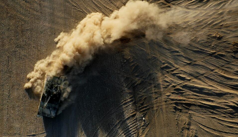 国产某新型步战车高速急停后,官兵在尘土飞扬中进行弹药快速补给。新华社记者琚振华摄