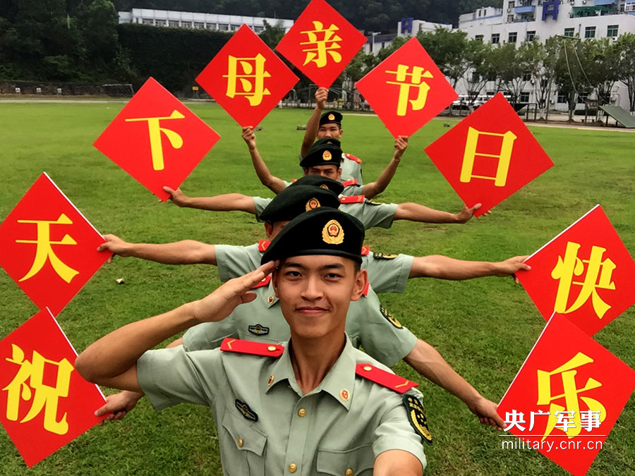 5月13日,武警广东省边防总队机动支队官兵手举祝福语,一起为母亲送上节日问候。