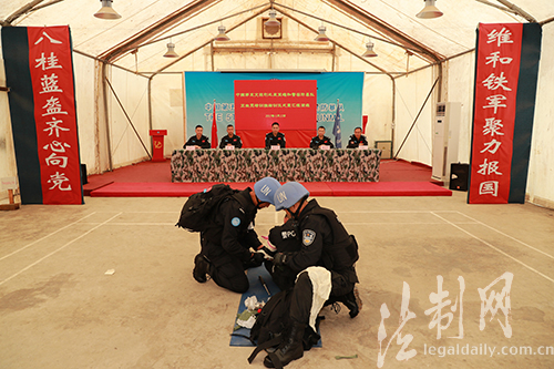 图为维和警察防暴队开展头部帽式包扎科目演练