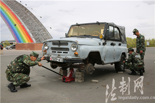 图为二连边防检查站官兵对涉嫌走私车辆进行分解检查