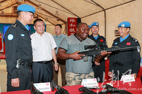图为利比里亚国防部副部长圣·杰罗姆·拉巴利观摩防暴队武器装备展示