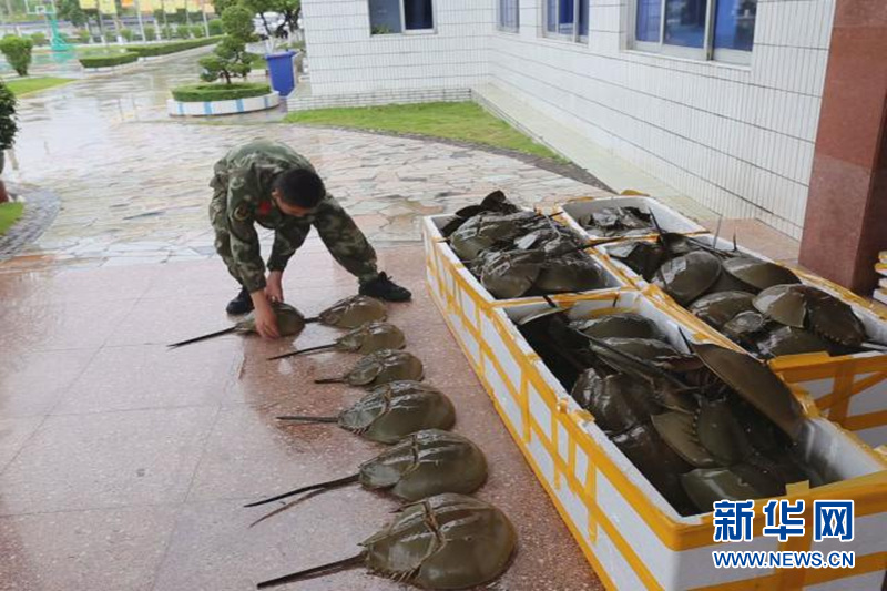 广西防城港边防支队横江边境检查站官兵日前在巡逻过程中查获117只国家二级保护动物中华鲎。