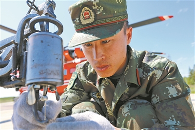 日晒、风吹、雨淋,直升机的“衣服”——蒙布发生破损怎么办?这可难不住心灵手巧的官兵。你看,武警森林指挥部直升机支队的代理机械师王丹宇就自己动手,从老乡那里借来手摇修鞋机,顶着盛夏的烈日一针一线仔细修补,看起来还挺有小裁缝的范儿呢。韩兴华 摄