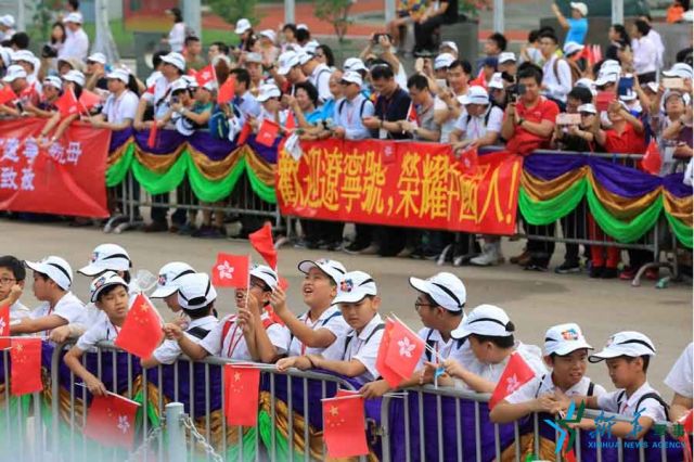 ↑7月7日,香港民众在昂船洲码头欢迎辽宁舰编队。新华社记者 曾涛 摄