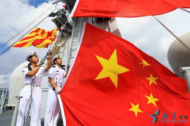 ↑辽宁舰在维多利亚湾泊后,信号兵将国旗升起。张凯 摄(据新华社客户端)