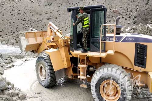 图为边防官兵正在指挥铲车进行抢修道路