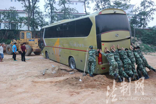 旅游大巴车后轮陷沙坑 秦皇岛边防官兵紧急救助