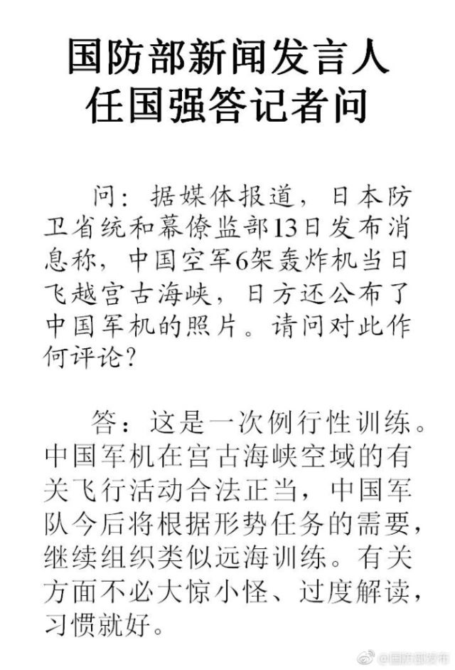 国防部:中国空军6架轰炸机飞越宫古海峡合法正当